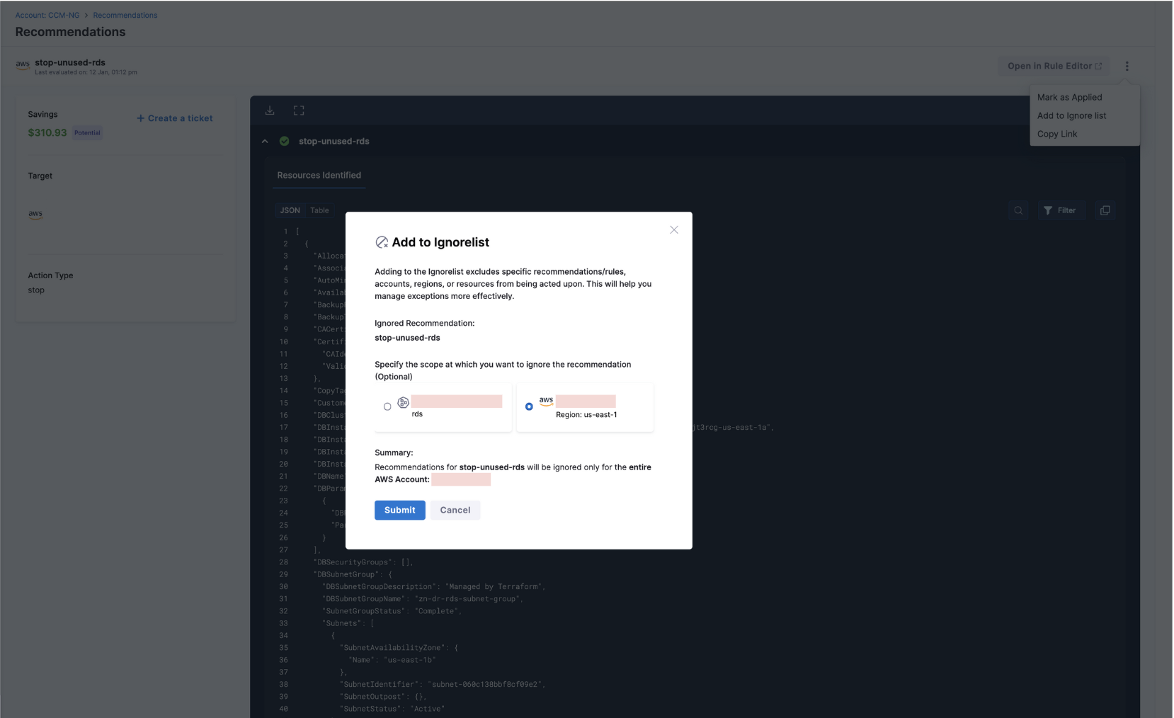 Owing to this, now, while adding a recommendation to Ignore List, users have the option to specify the scope at which the users want to ignore the recommendation. The scope can be either at: