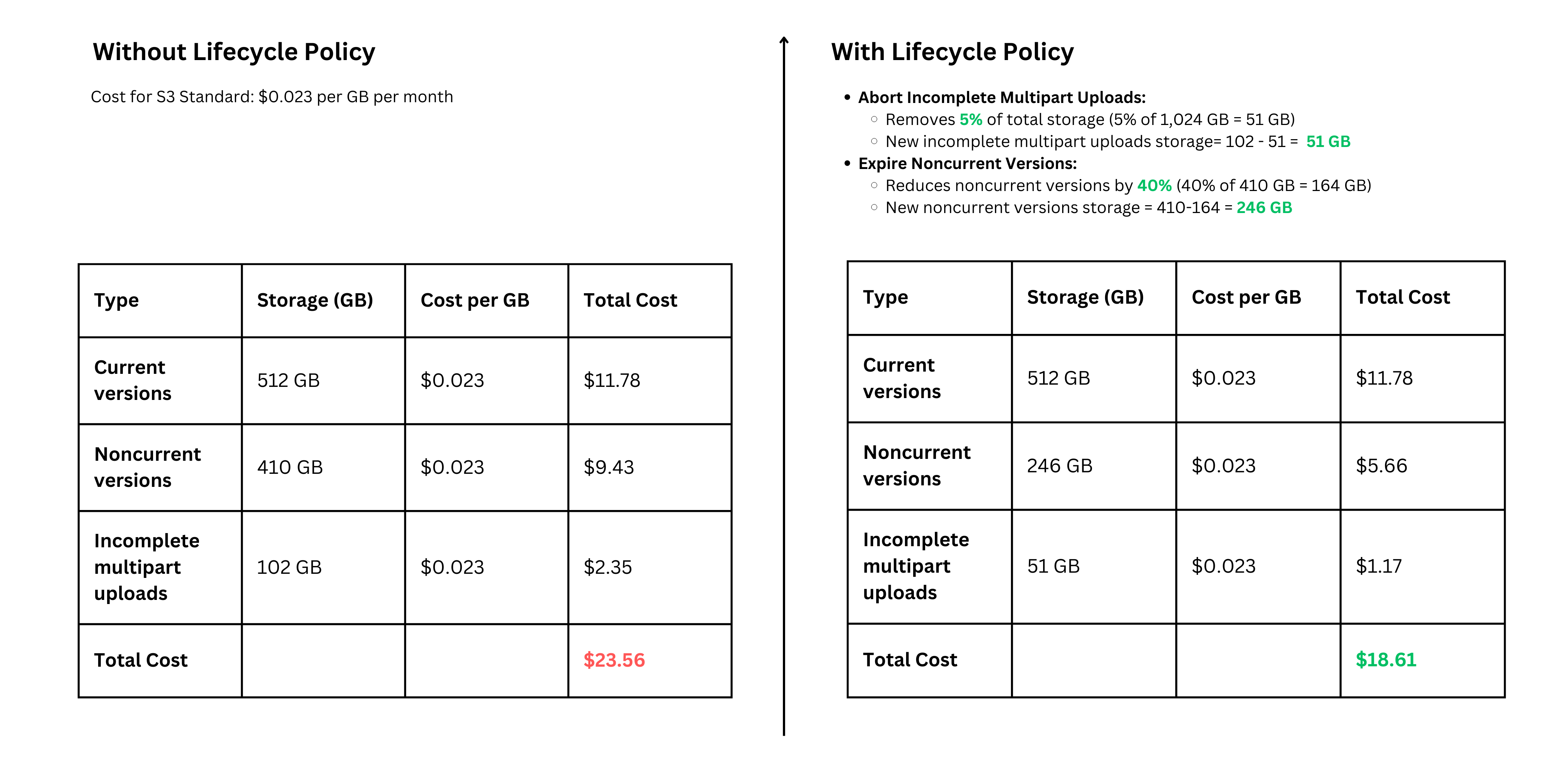 • Cost Impact: Deleting 40% of noncurrent versions reduces the total storage used by these versions.