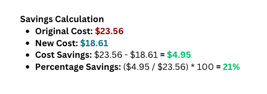 This results in a cost savings of approximately 32.76% compared to keeping all data in standard S3 storage (23.00permonthvs.23.00 per month vs. 15.463 per month).