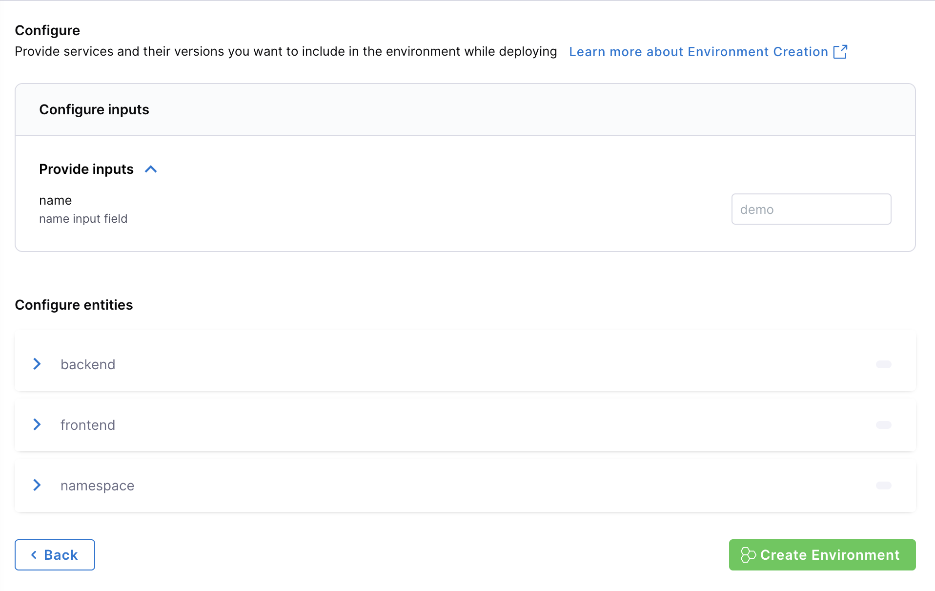 - On the new screen, you can choose and configure your inputs to the environment, and when you are satisfied, hit “Create Environment”.