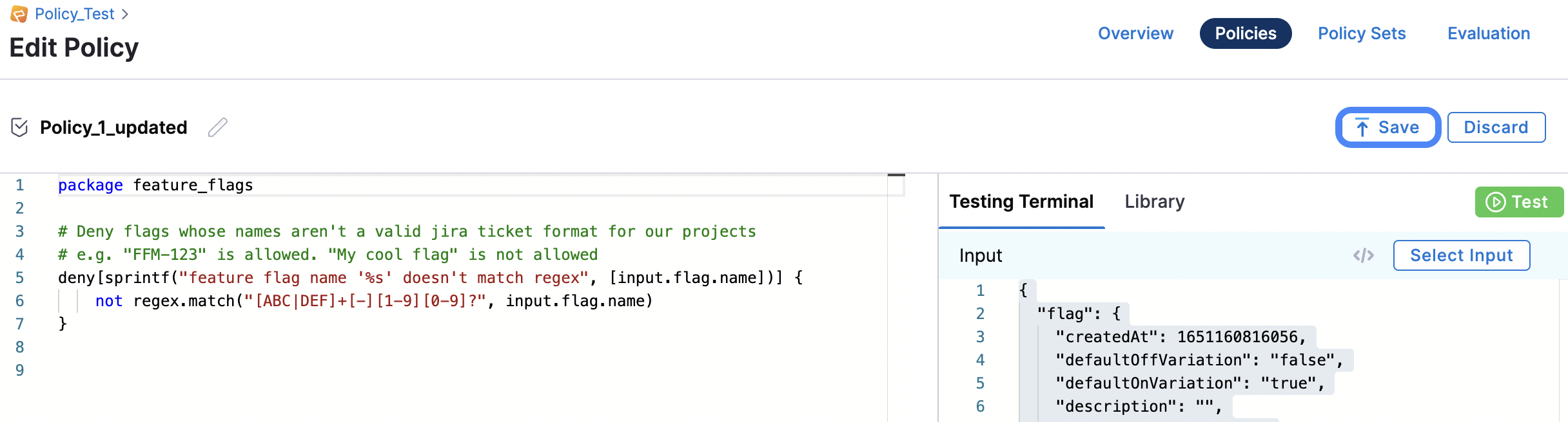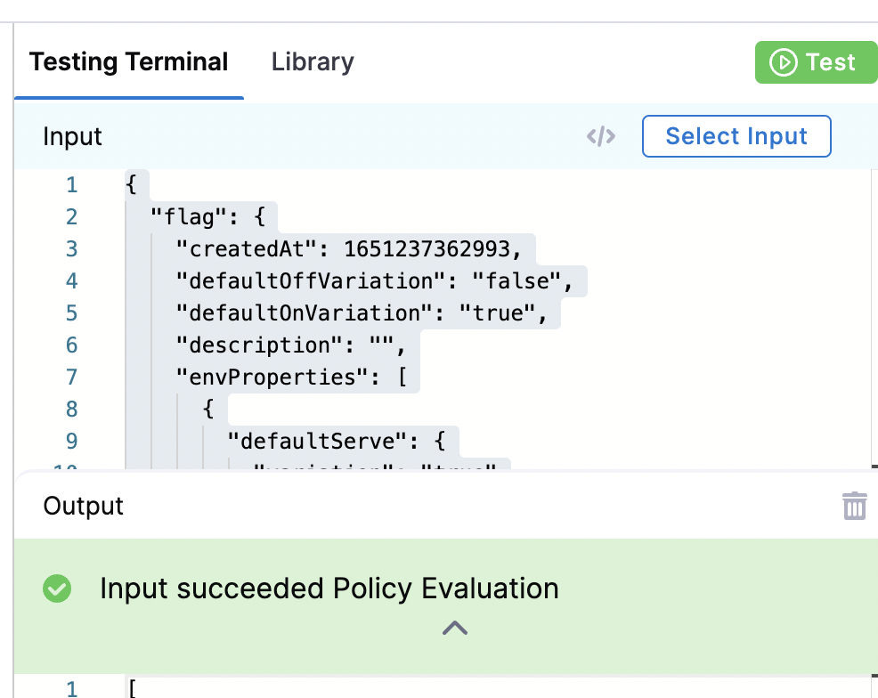 - To check your policy code is valid, test your policy against a previous Policy Evaluation in the Testing Terminal: