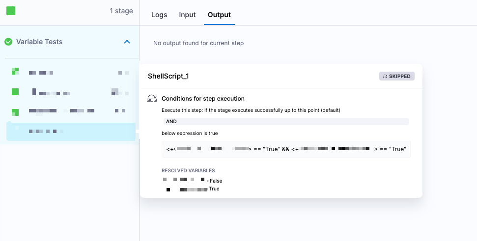 For users setting a JEXL Boolean condition, it is important to remember that a conditional that evaluates false will result in a skipped step or stage.