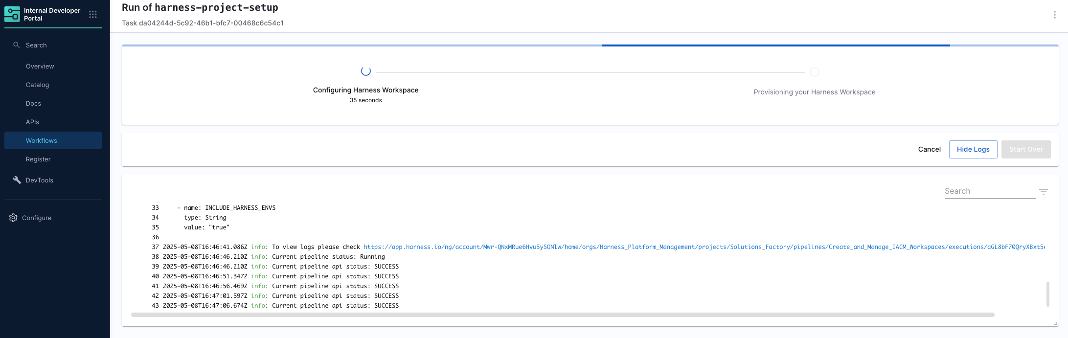 If you scroll down you will see another link that will direct you to the Create and Manage IACM Workspaces pipeline that is being run to start the workflow.